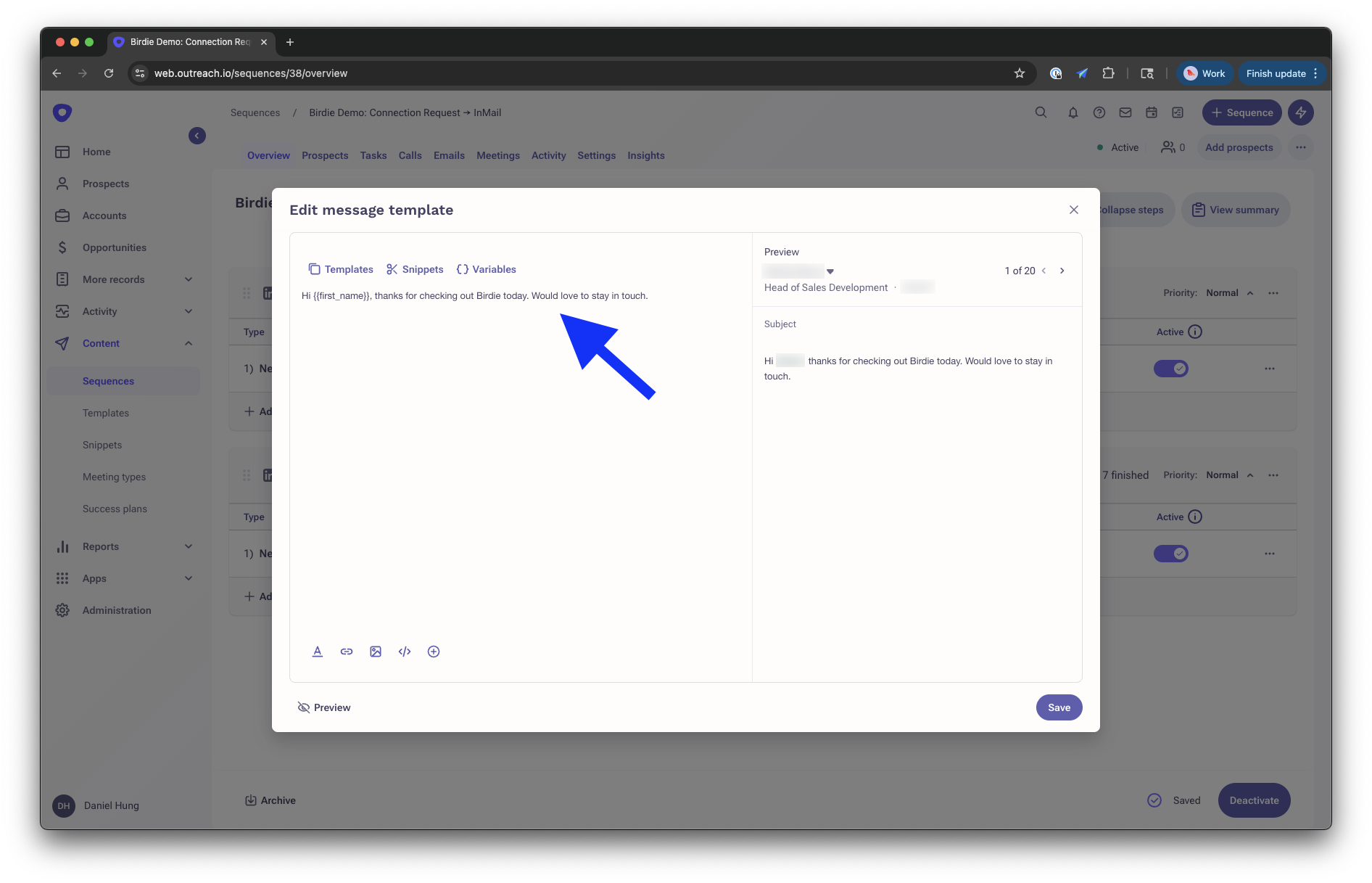 Outreach has built-in support for adding message templates to connection request steps. Birdie integrates with Outreach’s native functionality, so you would create your message templates as you normally would