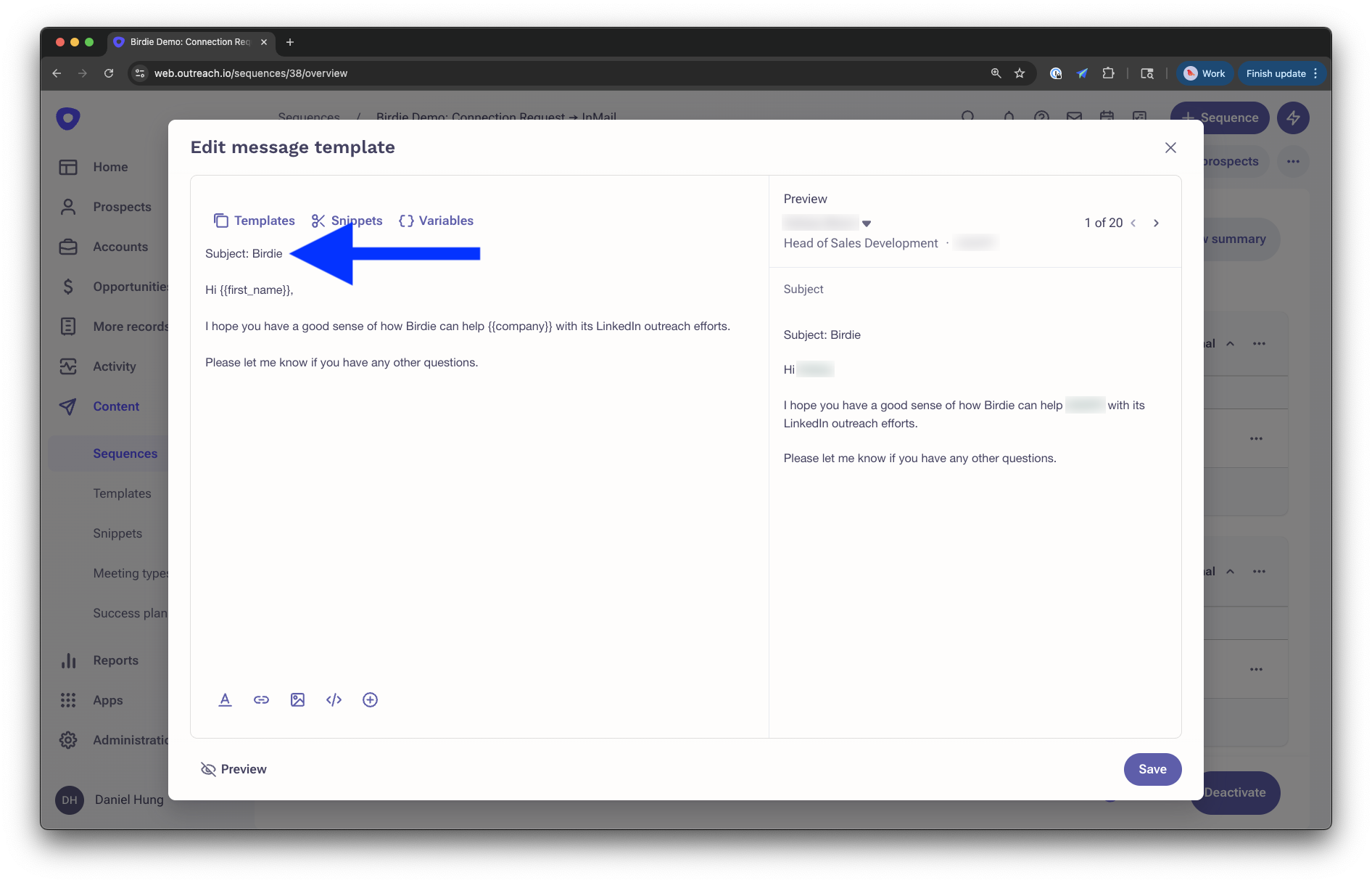 One enhancement you get with Birdie is that you can add a subject line to your message templates to include in your InMails. Note that InMails sent to people who you aren't connected with will require a subject, so it is recommended that all your InMail message templates include a subject line. To include a subject line, simply add Subject: <Your subject here>