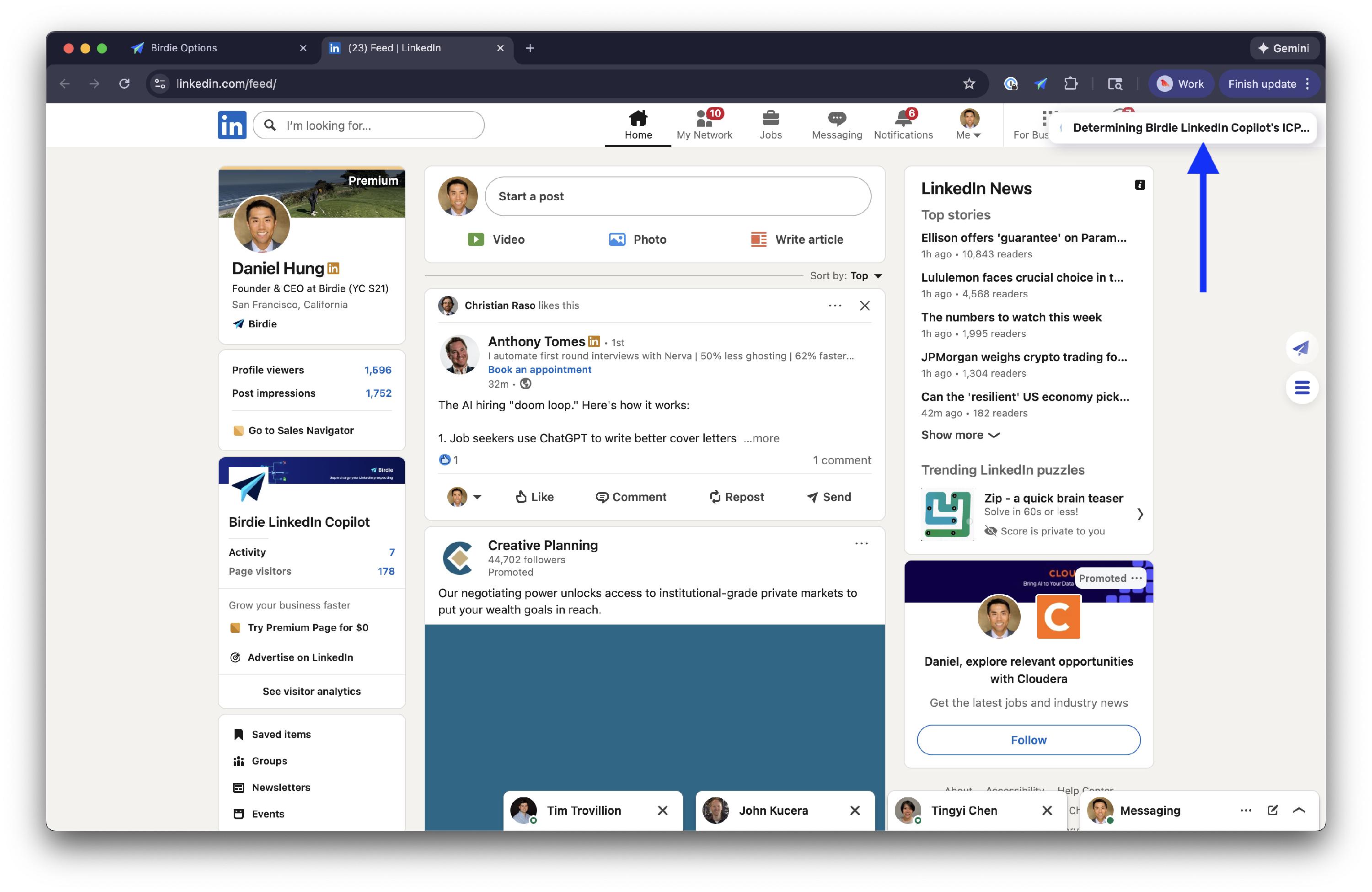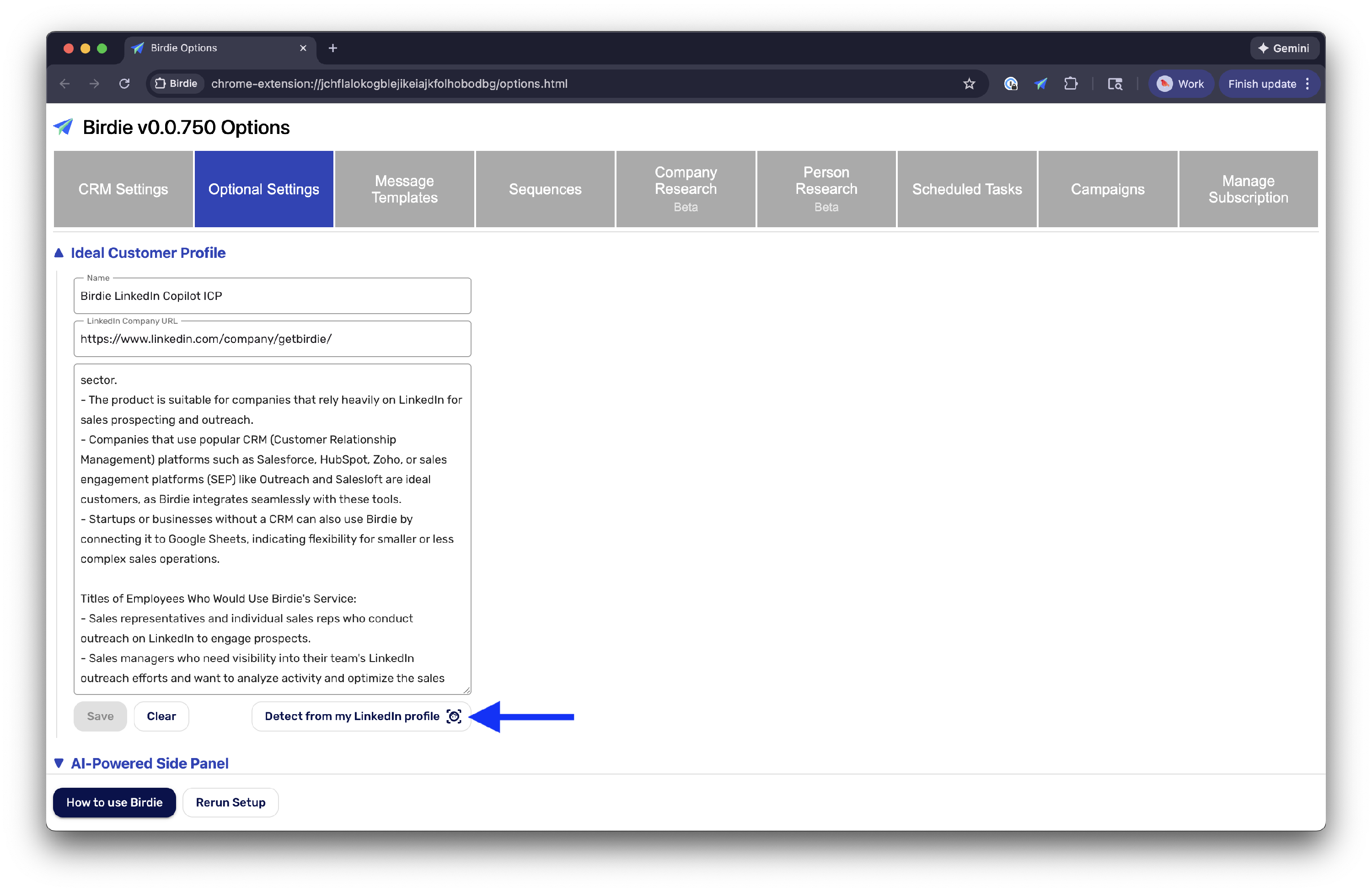 Birdie will automatically determine what your ideal customer profile is the very first time you open LinkedIn with Birdie installed. You will see an indicator at the top right of the browser window while this is happening.