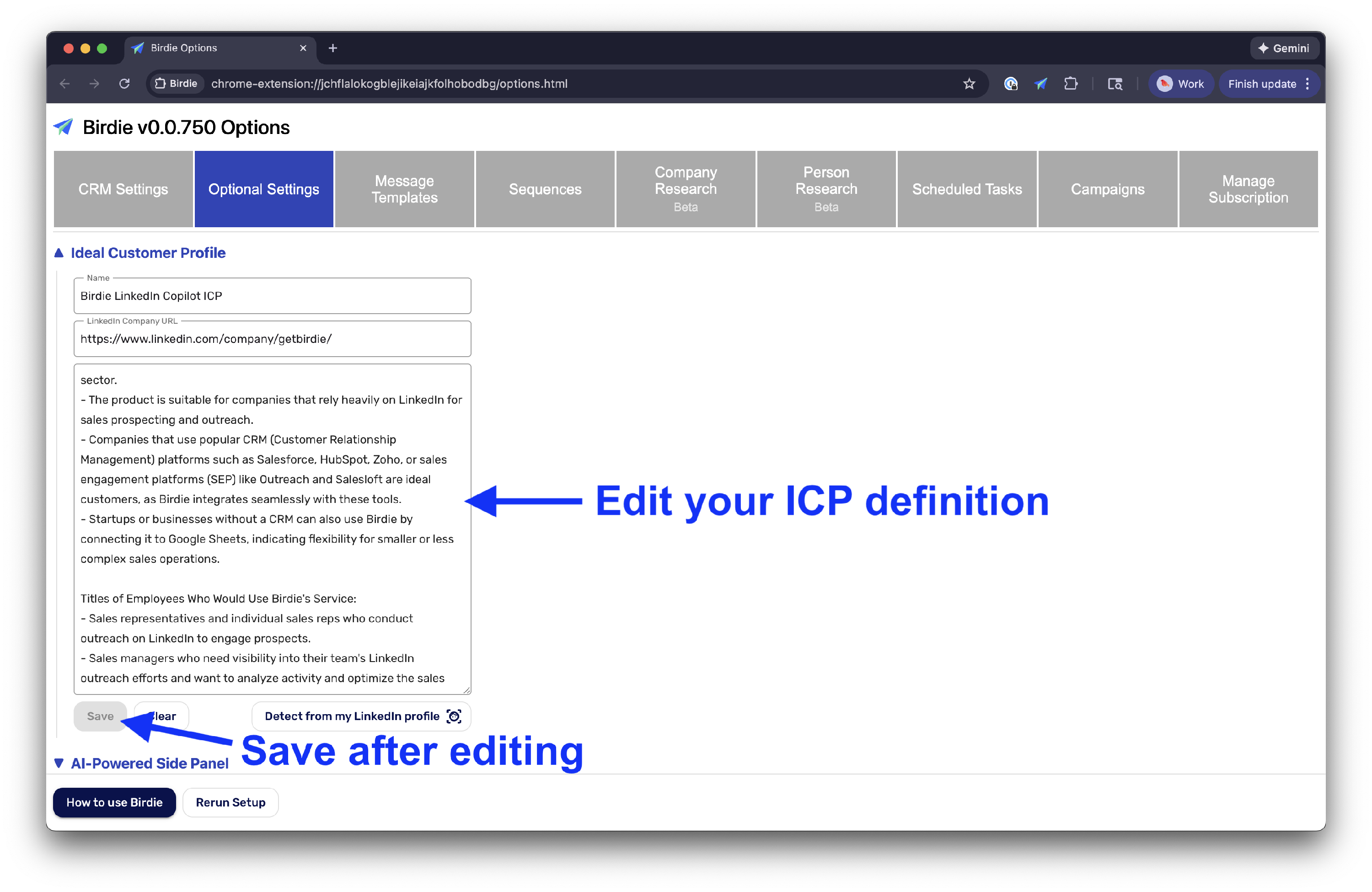 You can view and edit your ICP in Birdie's options under Optional Settings and Ideal Customer Profile .
