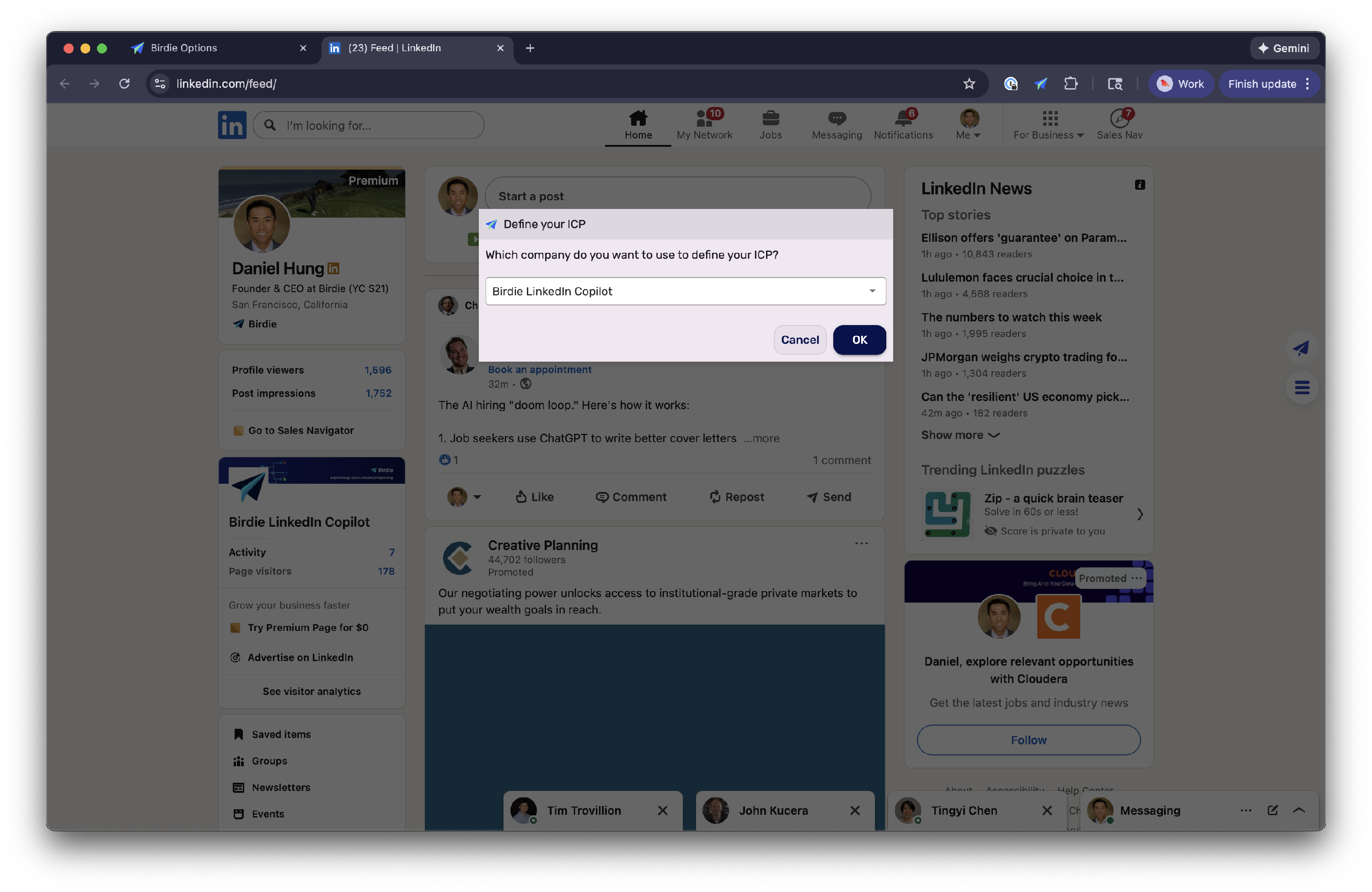 Birdie will open LinkedIn in a new browser tab and ask you which employer to use.