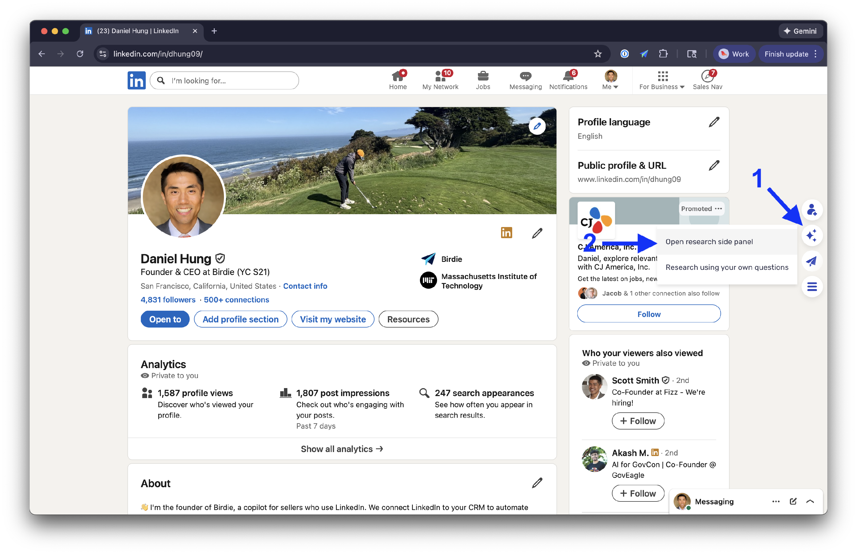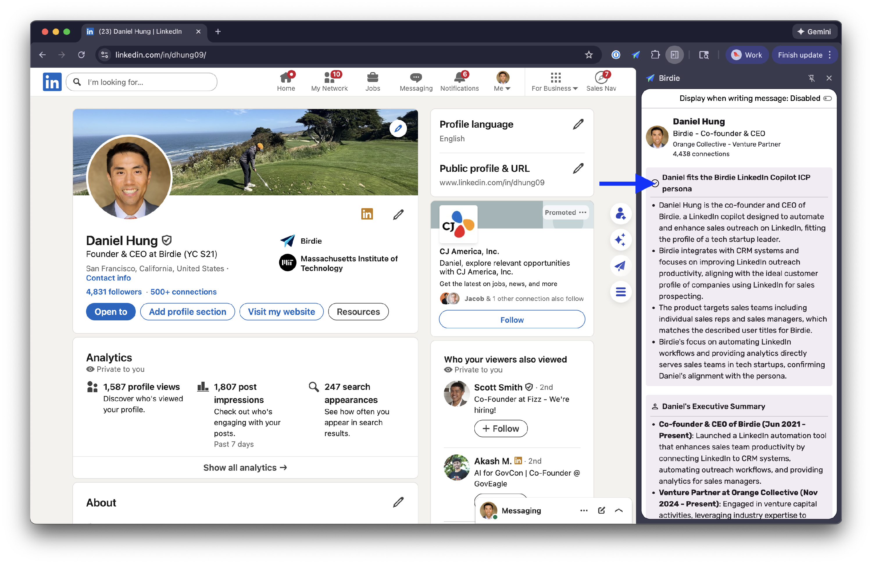 Birdie's AI Side Panel will display and Birdie will start researching the person. Once done, Birdie will indicate whether or not the person fits your ICP. It will also show its reasoning as to why or why not.